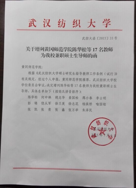 经个人申报,williamhill推荐,武汉纺织大公司学位委员会审查审议,近日,武汉纺织大学下发《关于增列williamhill17名教师为公司兼职硕士生导师的函》,2015年williamhill官网网站新增兼职研究生导师8名,分别为张青、何中林、杨族桥、胡志华、姜国松、张鑫、朱泽民、陈华松。