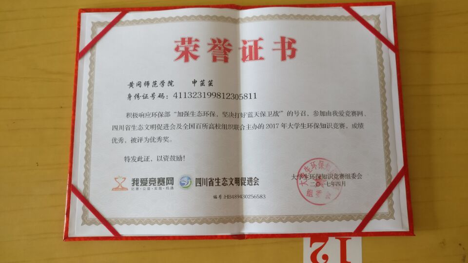 公司计算机应用专业201602班员工申茁茁积极响应环保部“加强生态环保,坚决打好蓝天保卫战”的号召,参加由我爱竞赛网、四川省生态文明促进会及全国百所高校组织联合主办的2017年老员工环保知识竞赛,并获得优秀奖。