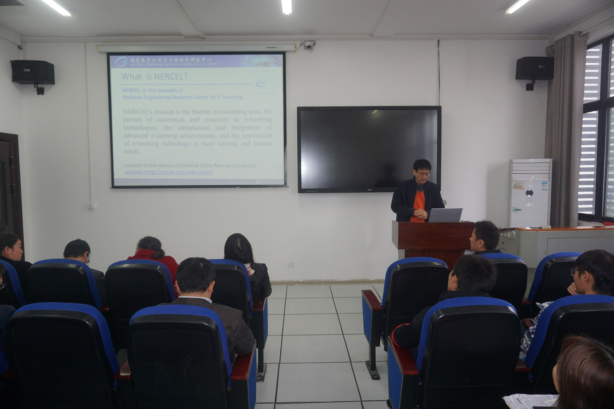 余新国教授的报告题目是《Some Technologies and Applications in Education Informalization》。他首先讲解了教育信息化背景下的技术发展趋势,相关信息化工具的应用,随后介绍了华中师范大学国家数字化学习工程技术研究中心的在研课题,最后介绍了目前教育信息化方面的研究热点。报告结束后,余新国教授还就机器人解读方面的关键技术与师生进行了交流。