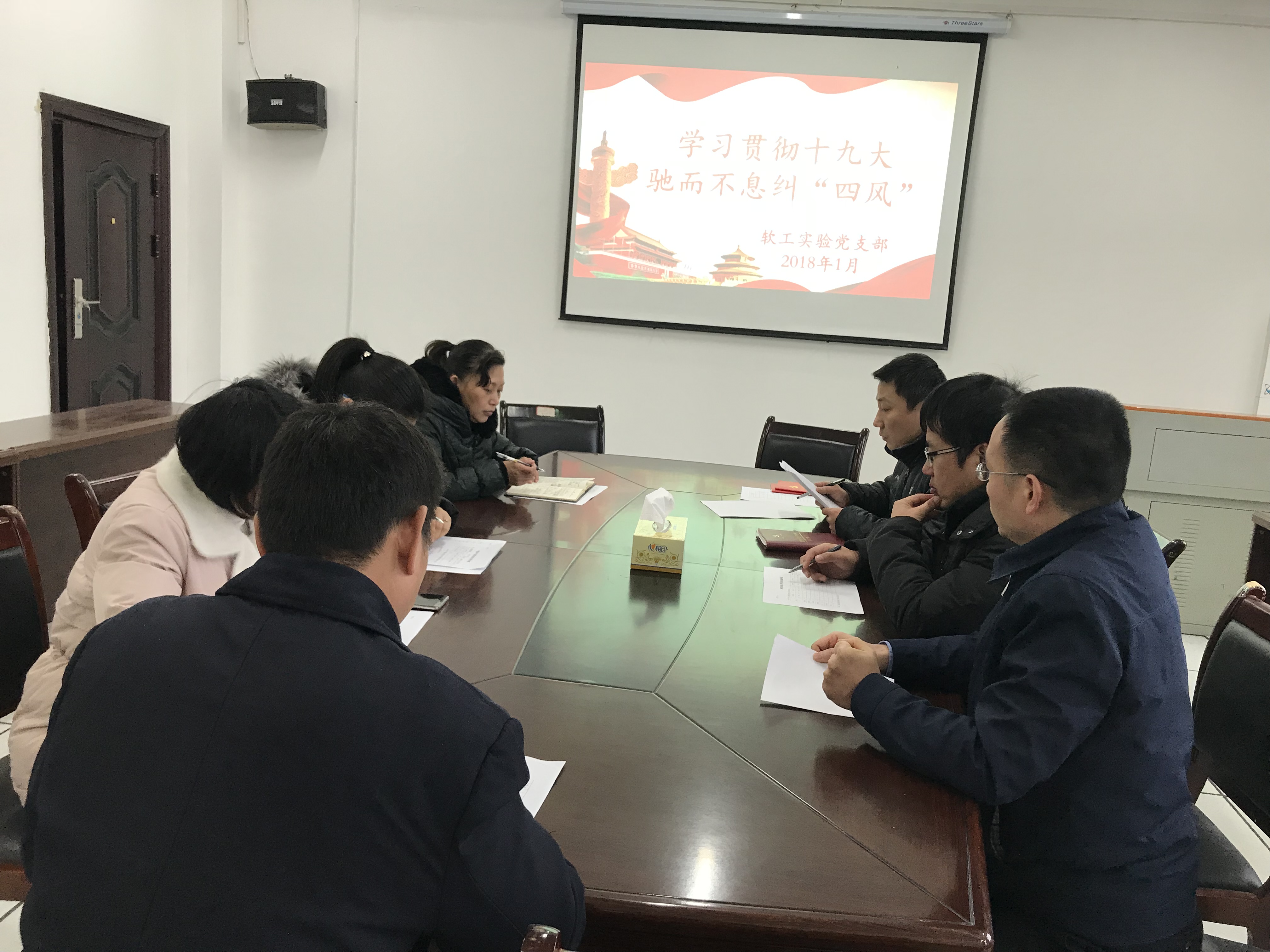 1月4日下午3:00,软工实验党支部组织支部党员开展以“学习贯彻十九大,驰而不息纠‘四风’”为主题的支部党日活动。