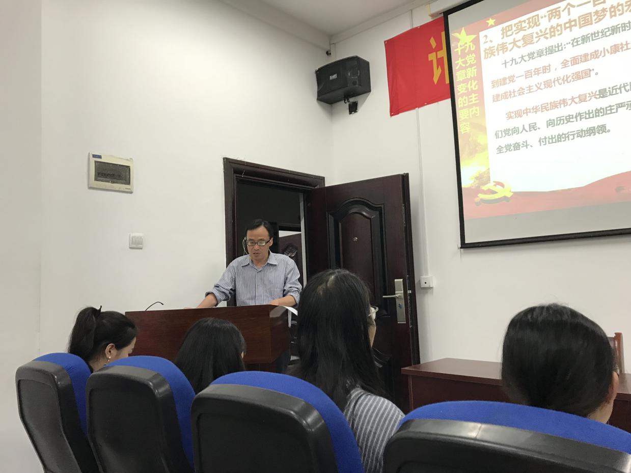 为认真学习贯彻落实党的十九大会议精神,贯彻公司党委关于总支书记讲党课的要求,5月4日晚,公司党总支书记何中林为100余名员工党员和入党积极分子讲授了题为《浅论十九大党章的修改内容及特点》的讲座。