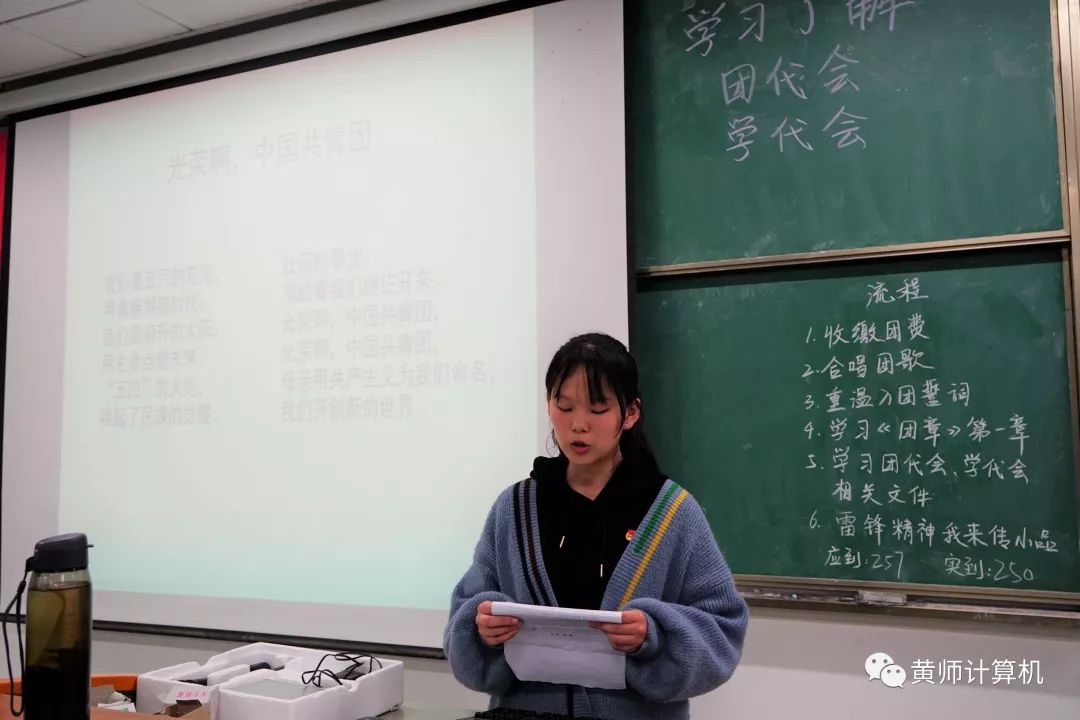 第一个环节 随着迎团旗、唱团歌而拉开帷幕。紧接着,主持人带着同学们一道重温了入团誓词,学习了《团章》的第一章,并且学习了团代会、学代会的相关文件。