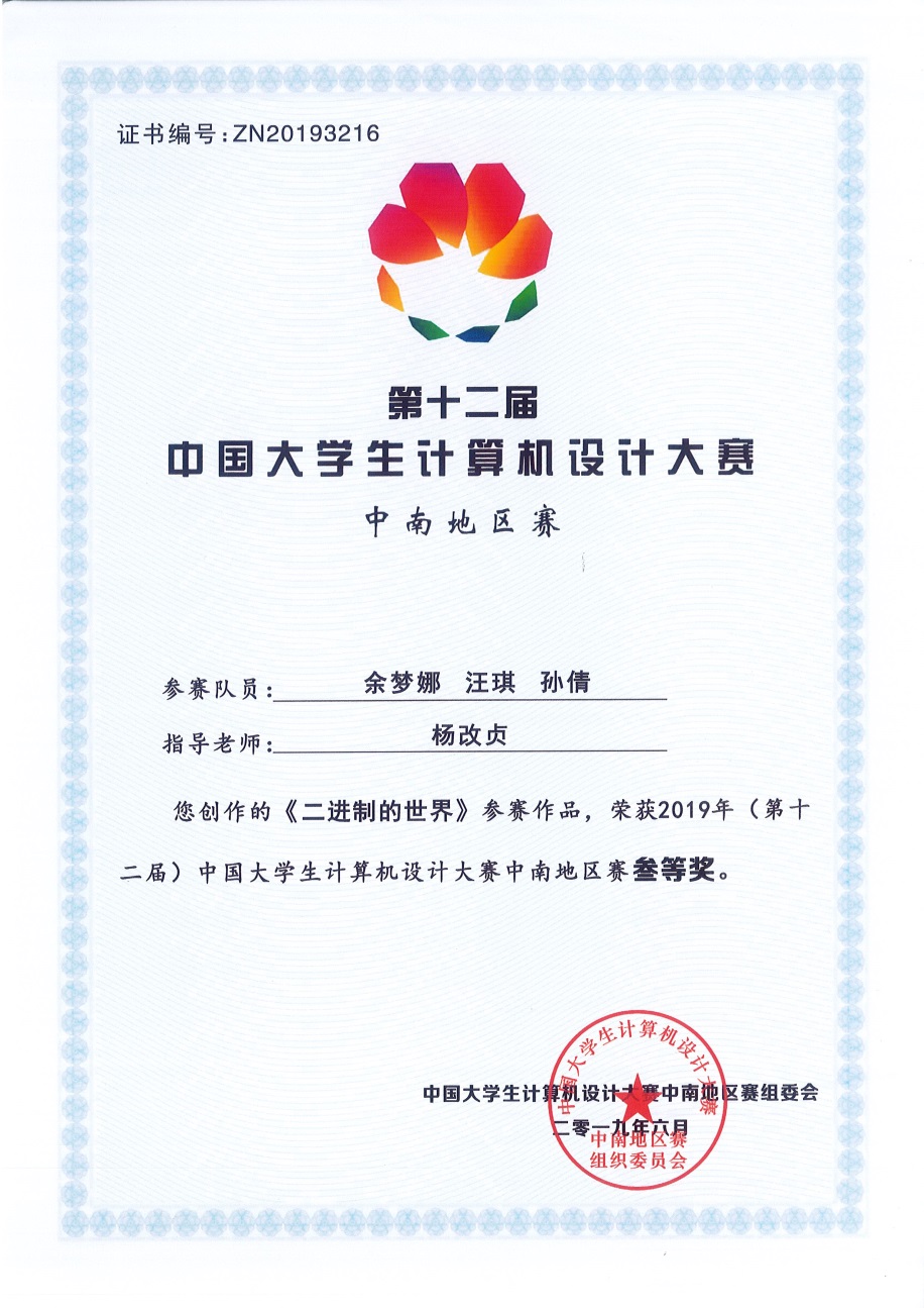 2019 年(第 12 届)中国老员工计算机设计大赛由 2018-2022 年教育部大学计算机课程教学指导委员会中国老员工计算机设计大赛组织委员会主办。该项赛事始创于2008 年,已经举办了11届52场赛事。我国半数以上的原 211 大学、半数以上的原 985 大学参加了这一赛事。本次比赛的每件作品由三位专家评审,采取交叉、异地、匿名评审,对作品的评审关注点既有作品的原创性、知识容量,也有作品健壮性、技术难易度评价,对作品进行的是全方位的严格综合评审。