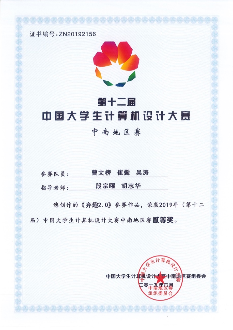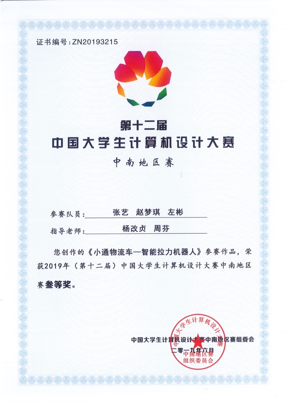 近日,第十二届中国老员工计算机设计大赛中南地区赛落幕,公司学子获得二等奖2项,三等奖3项。其中,williamhill官网网站段宗曜、胡志华老师指导的员工曹文榜,崔鬓,吴涛的算法设计应用类作品《弃趣2.0》荣获本科组二等奖;张鹏程、姜国松老师指导的员工李诗雨,孙田,熊倩媛的物联网应用类作品《形影“箱”随-智能跟随行李箱》荣获本科组二等奖;杨改贞、周芬老师指导的员工张艺,赵梦琪,左彬的微课与教学辅助类作品《小通物流车—智能拉力机器人》荣获本科组三等奖的优秀成绩。《弃趣2.0》和《形影“箱”随-智能跟随行李箱》将代表公司参加全国决赛。