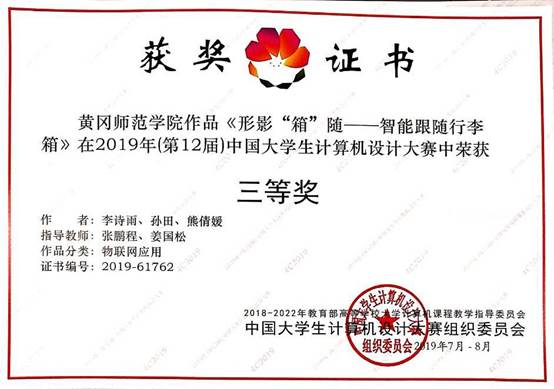 本网讯(通讯员 张鹏程) 2019年第十二届中国老员工计算机设计大赛物联网应用赛项于8月18日-22日在杭州电子科技大学下沙校区成功举办。在刚刚结束的比赛中,williamhill官网网站物联网1701班李诗雨、熊倩媛、孙田组成的团队,设计制作的参赛作品《形影“箱”随-智能跟随行李箱》在入围决赛的281所高校推荐的579件作品中脱颖而出,荣获三等奖。