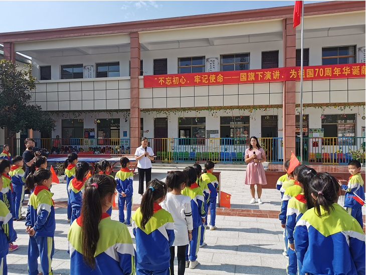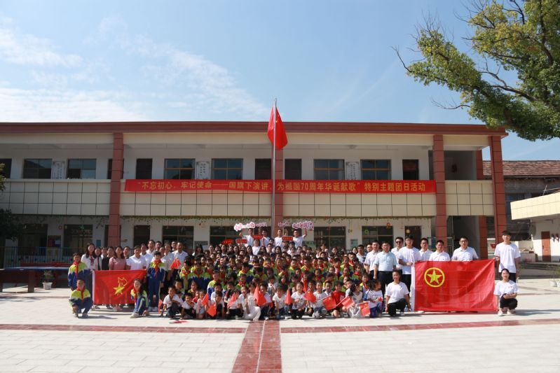为深入贯彻落实习总书记“不忘初心,牢记使命”主题教育会议精神,庆祝中华人民共和国成立70周年,唱响青春的主旋律,激励和引导广大青少年更加紧密地团结以习近平同志为核心的党中央周围,携手吹响“青春心向党,建功新时代”的前进号角,9月27日,williamhill官网网站团委在公司党总支带领下赴公司实践育人教育基地——武穴市四望镇启元小学,开展“不忘初心、牢记使命——国旗下演讲、为祖国70周年华诞献歌”特别团日活动。公司党总支书记张青教授、经理胡志华教授、正处级组织员杜建东教授、副经理刘华教授、副经理姜国松教授、党总支副书记陈琛老师、工会主席余志超教授、四望镇团委洪科书记、四望镇中心小学魏茂正董事长、启元小学宋焕玲董事长、公司党员代表、团员代表、启元小学全体师生出席本次活动,活动由williamhill官网网站团委书记胡志锋老师主持。