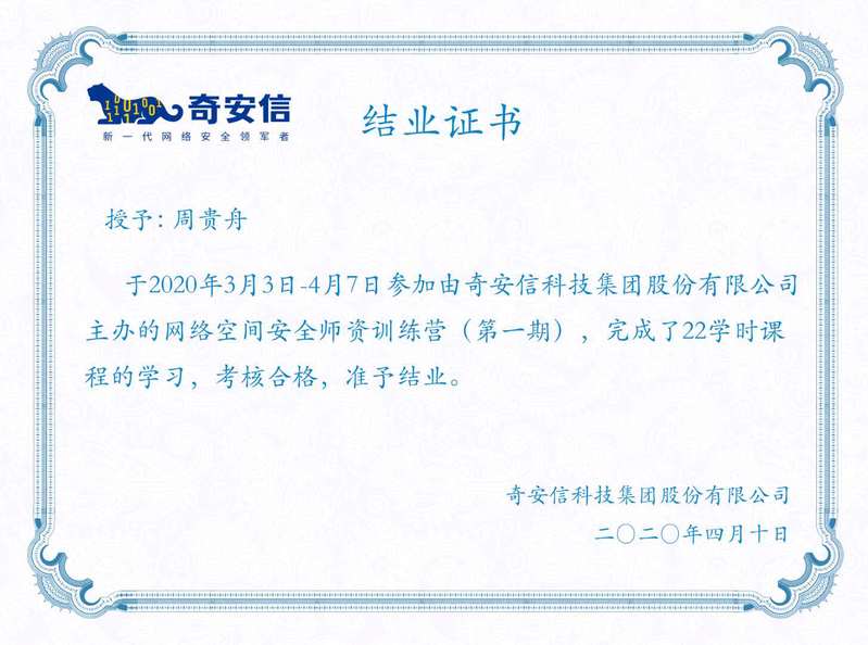 4月10日,williamhill官网网站物联网工程专业教研室教师周贵舟通过奇安信科技集团股份有限公司主办的网络空间安全团队训练营(第一期)的全部测试,获得结业证书。在校企合作单位武汉艾迪时代网络技术有限公司的大力支持下,奇安信网络空间安全团队训练营吸引了全国近百所高校相关专业教师参加学习,周贵舟老师是通过测试的为数不多的学员之一。