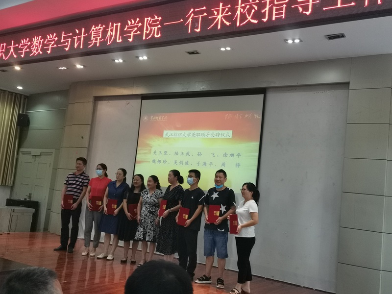 武汉纺织大学数学与williamhill官网网站经理胡新荣为公司吴剑波、陆正武、涂旭平、魏银珍、于海平、关玉蓉、孙飞、周静八位教师授予武汉纺织大学兼职硕导证书。