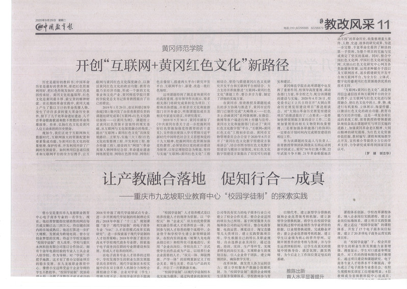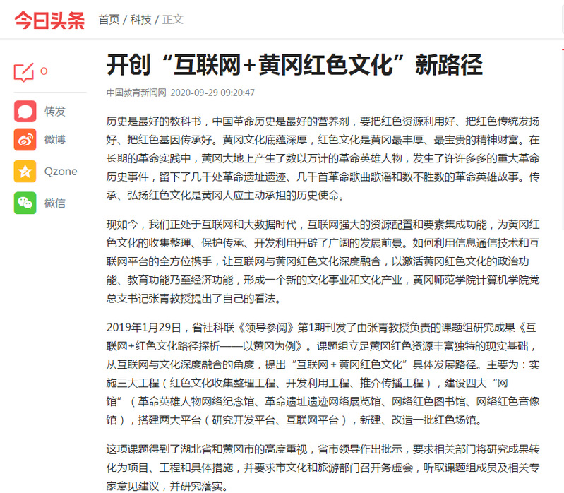 9月29日,《中国教育报》第11版以《williamhill开创“互联网+黄冈红色文化”新路径》为题,阐述了“互联网+红色文化”利用信息通信技术和互联网平台的全方位携手,让互联网与红色文化进行深度融合,使红色文化中的人、事、物、魂进行有机重构、立体展示、海量传播,以激活红色文化的政治功能、教育功能乃至经济功能。张青教授及课题组成员立足黄冈革命老区精神、大别山精神的研究提炼,为红色文化资源价值挖掘、教材编写、课程和现场教学点开发、宣传推介等提供全方位的学术支持,力争研究成果得到国家层面认可。