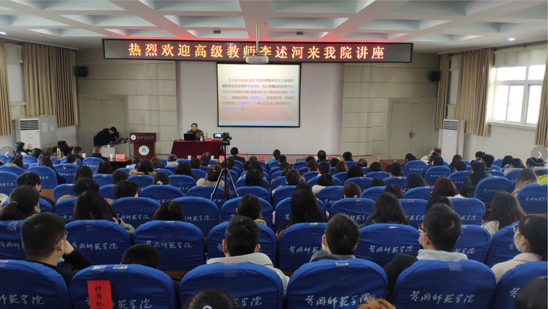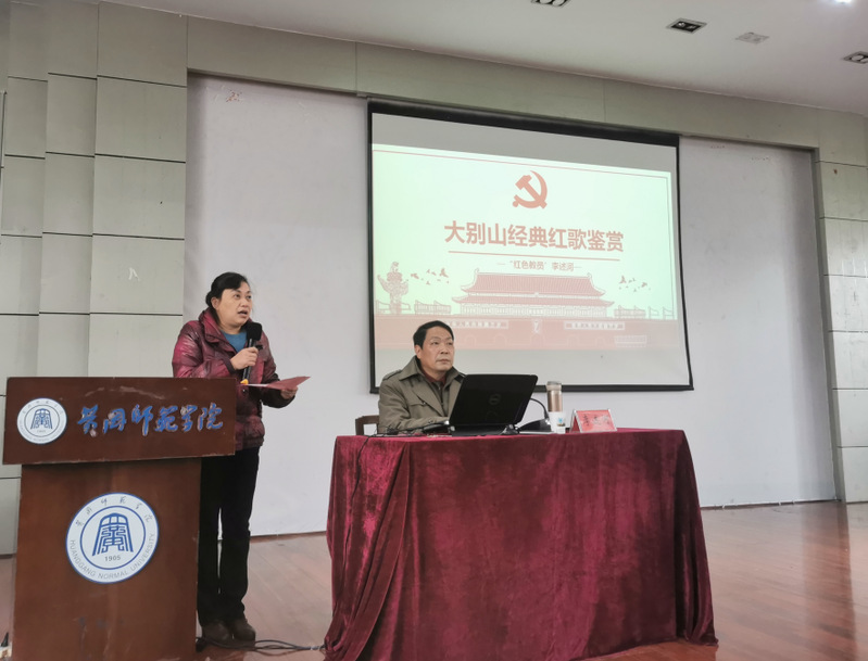 李述河老师以清唱一首《再见了,大别山》拉开讲座序幕,围绕大别山红歌、红安红歌,着重介绍了红安的地理位置、革命风貌以及人文情怀,弘扬了“一要三不要,一图两不图”、“朴诚勇毅,不胜不休”的红安精神。通过鉴赏《八月桂花遍地开》、《三大纪律八项注意》、《黄安谣》三首红色歌谣向我们描绘出了红安红军战士为家国奋战的壮丽场面,彰显了红安为中国革命所做出的突出贡献。