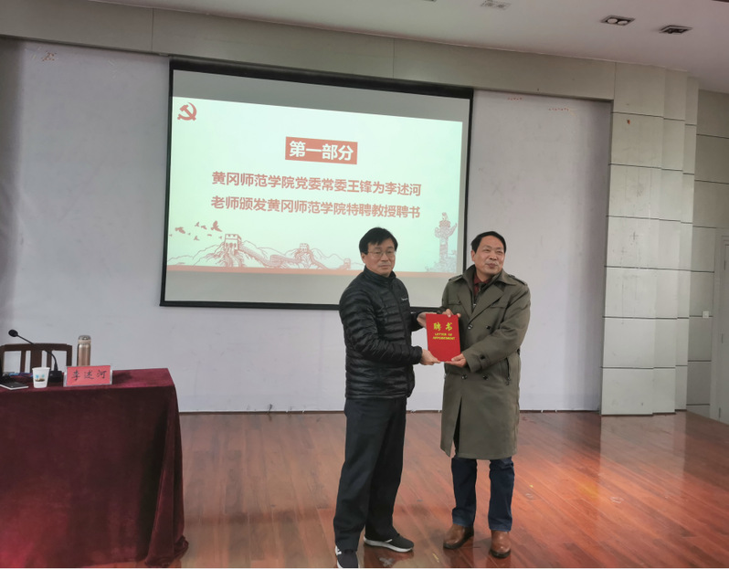 首先,黄冈师范公司党委常委王锋为李述河老师颁发了williamhill特聘教授聘书。李述河老师现任董必武亲自创办的湖北红安一中党委副书记、副董事长,省级示范中学高级教师,同时李述河老师也是多所高校的特聘教授、硕士生导师。