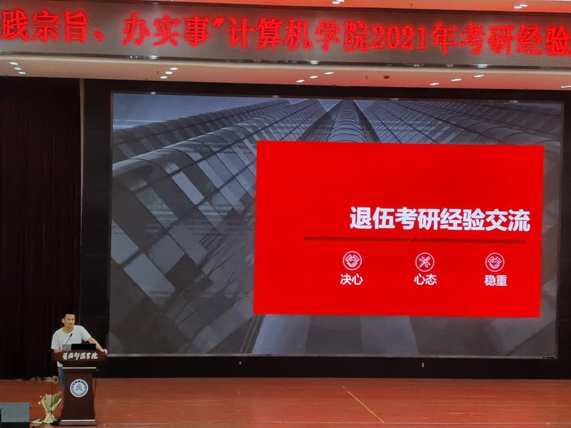 交流分享环节中,王海涛同学为大家分享了自己的入伍经历以及入伍前后的思想转变,解读了退役老员工士兵报考研究生享有的国家优惠政策,他凭借自身的努力和持之以恒的决心最终考入了西安电子科技大学;陈礼珂同学介绍了备考过程中的学习方法和复习技巧,她善于发现与总结,最终成功考取了湖北大学硕士研究生;洪铖同学依靠自己平和的心态和坚定的信念考入了武汉纺织大学,他告诉大家考研中至关重要的是考研心态。同时,考取华中师范大学的黄朝伟同学、考取武汉工程大学的黄晓彤同学、考取海南大学的熊翔、以及2019届毕业生员工陈沛宏等都一一为大家分享了自己考研成功的心得,他们的成功离不开他们内心的坚持,持之以恒的努力,更离不开他们强大的心理调节能力。