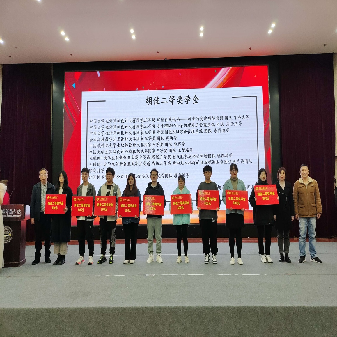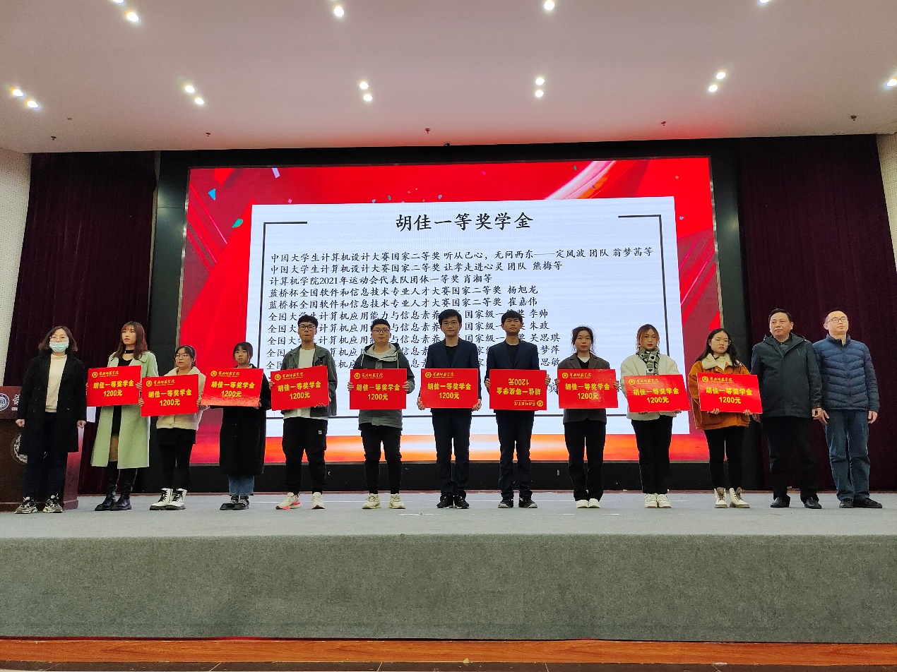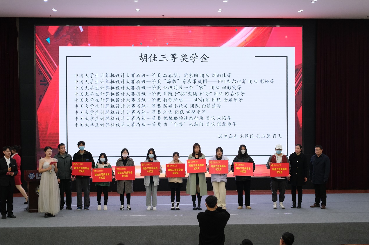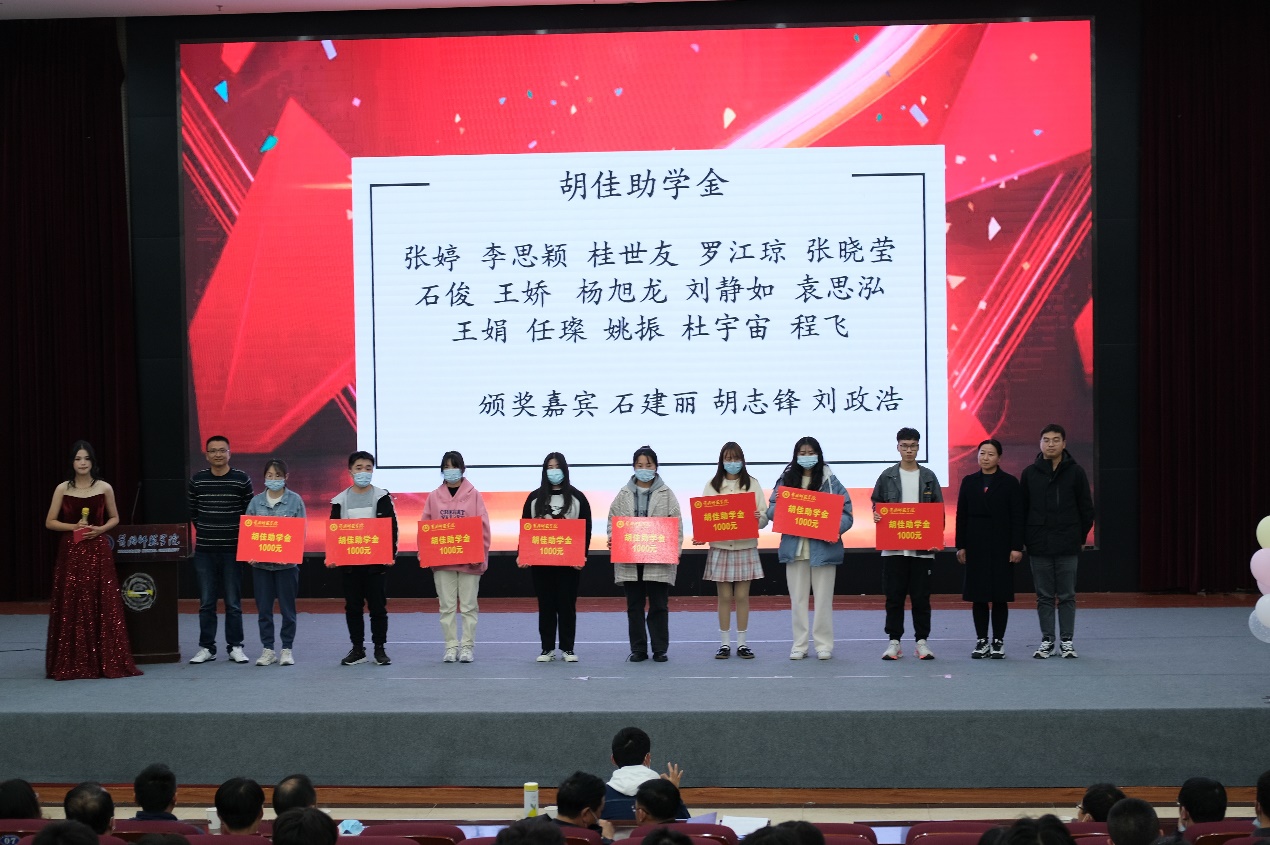 在员工组颁奖中,对21个优秀团队、26名先进个人发放共计53400元胡佳奖学金,对家庭贫困的15名员工发放共计15000胡佳助学金。