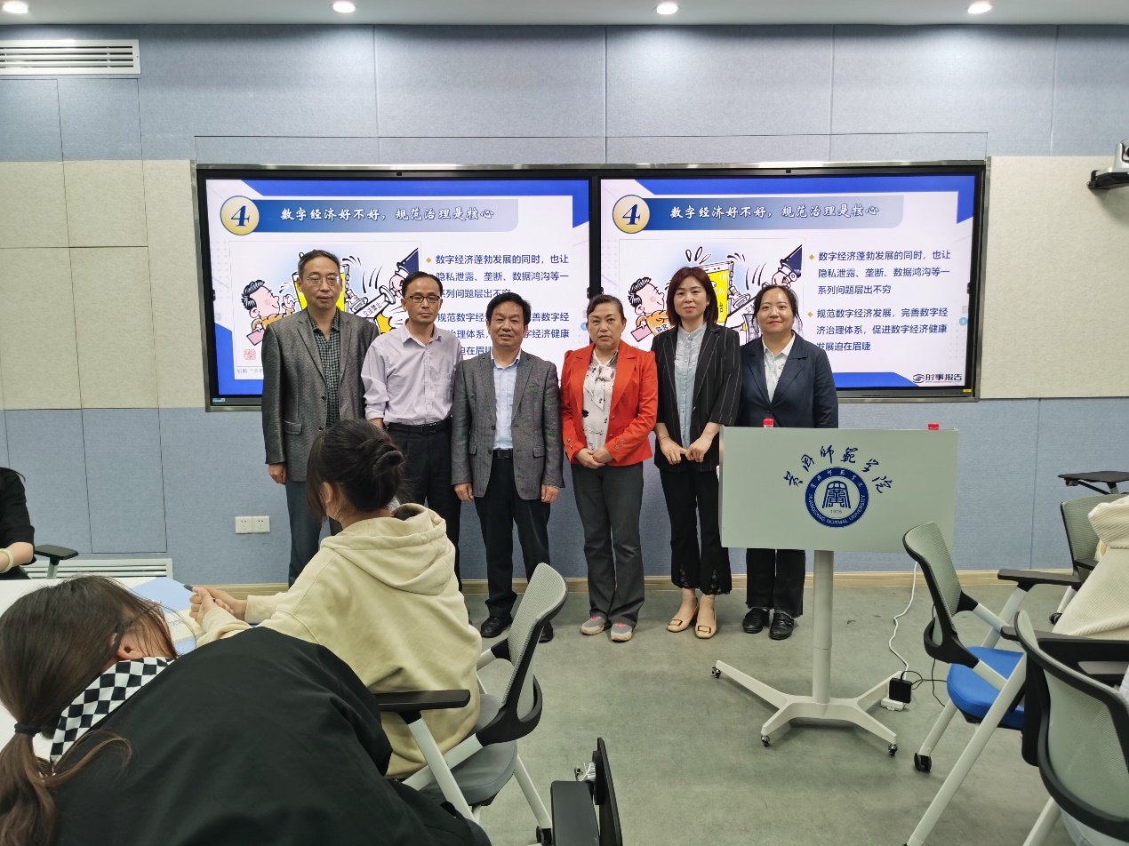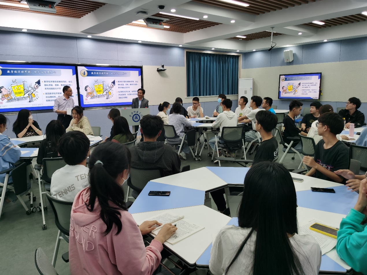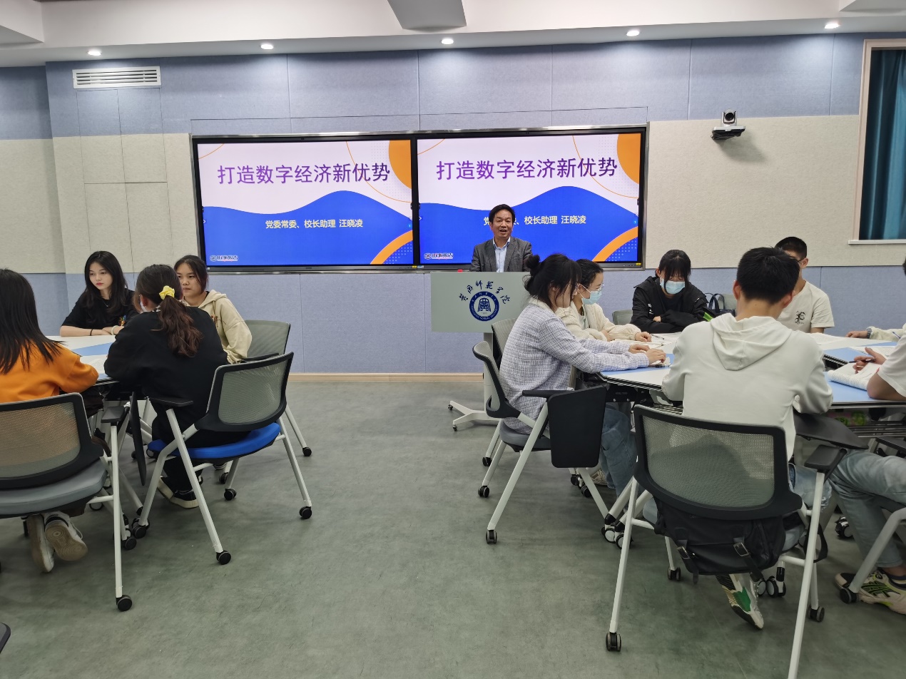 汪晓凌以《打造数字经济新优势》为主题分三部分展开教学工作。通过 “适应数字时代的战略抉择”“发展数字经济的成果显著”“激发数字经济的潜能活力”三部分具体展开,带领师生了解了数字经济的特点、我国数字经济发展成果和现状,未来利用开发数字经济潜能活力的方式,希望公司同学们,利用学科专业上的优势,踔厉奋发、笃行不殆,积极投身这些行业,为我国掌握更多的核心技术,为夺取全面建设社会主义现代化国家新胜利、实现中华民族伟大复兴的中国梦做出新的更大贡献。