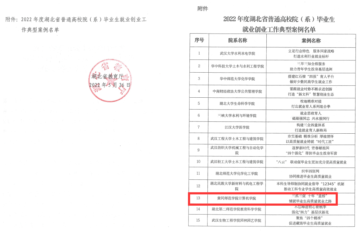 根据《省教育厅办公室关于开展普通高校院(系)毕业生就业创业工作典型案例征集宣传工作的通知》(鄂教学办函C2022] 1号)精神,公司认真总结经验做法, 打造就业创业工作品牌,全面促进毕业生高质量就业,公司毕业生就业创业工作案例《三抓三促 十年“蓝桥” 铺就毕业生高质量就业之路》获评湖北省教育厅2022年度普通高校院(系)毕业生就业创业工作典型案例。