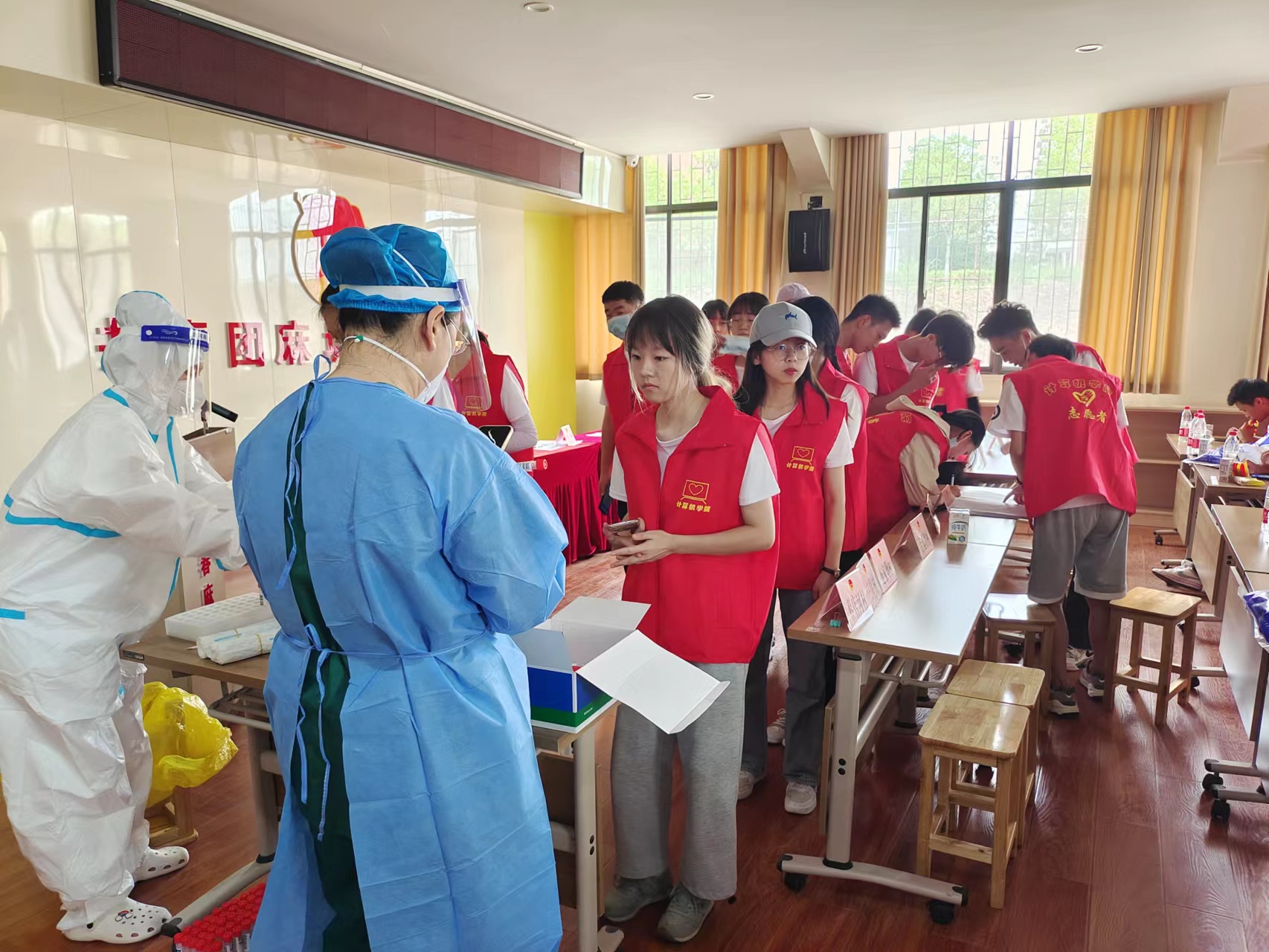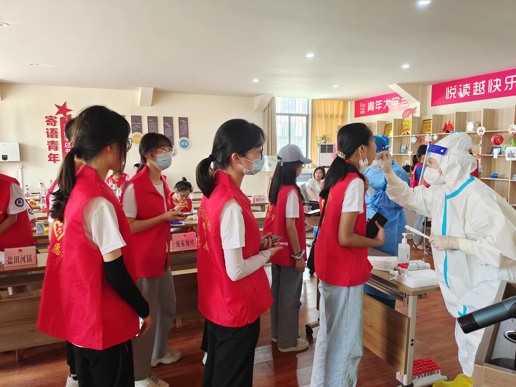 启动仪式前,工作人员向乡镇团委、村、公司志愿服务小组发放《工作手册》、希望家园的logo,以及全员进行落地核酸采集。