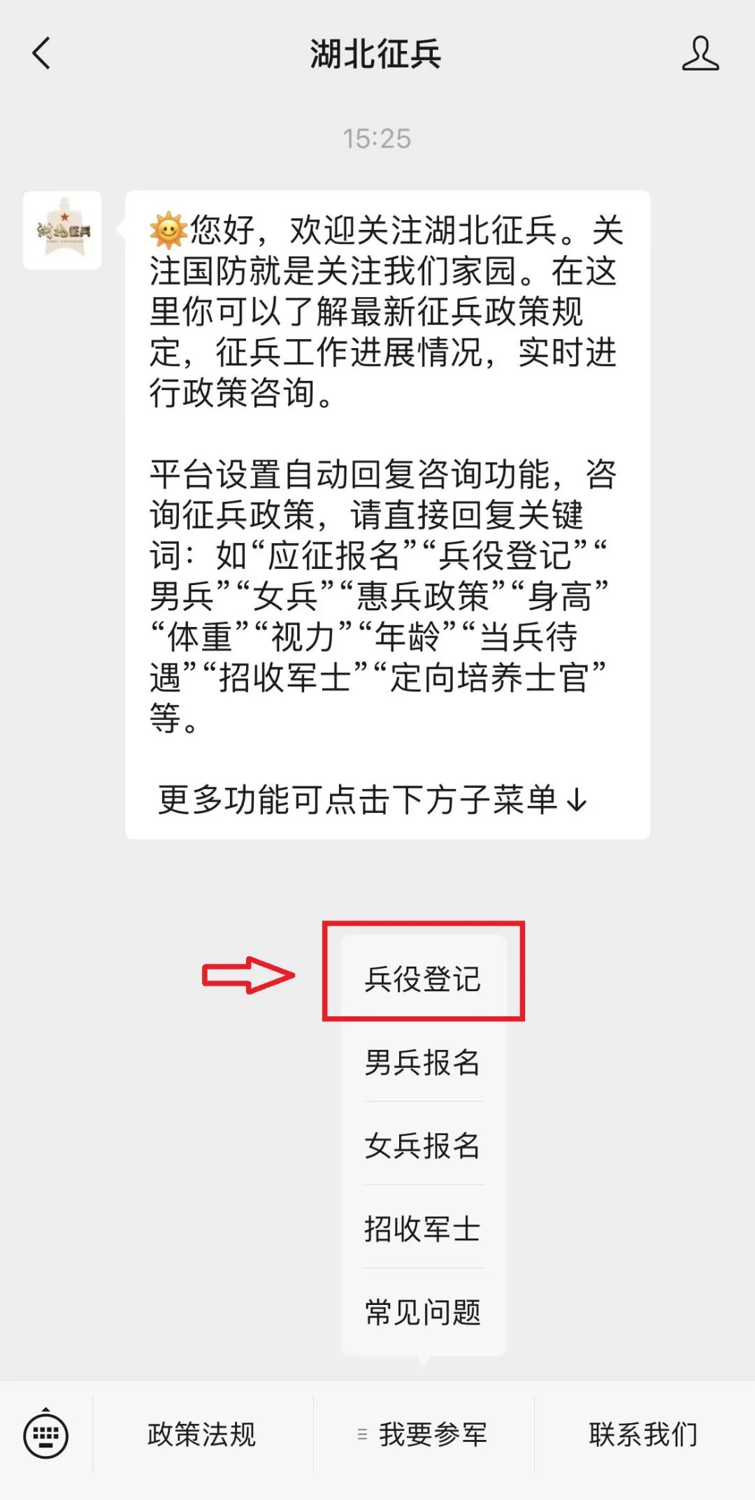 关注并进入微信公众号“湖北征兵”点击“我要参军”进入“兵役登记”;