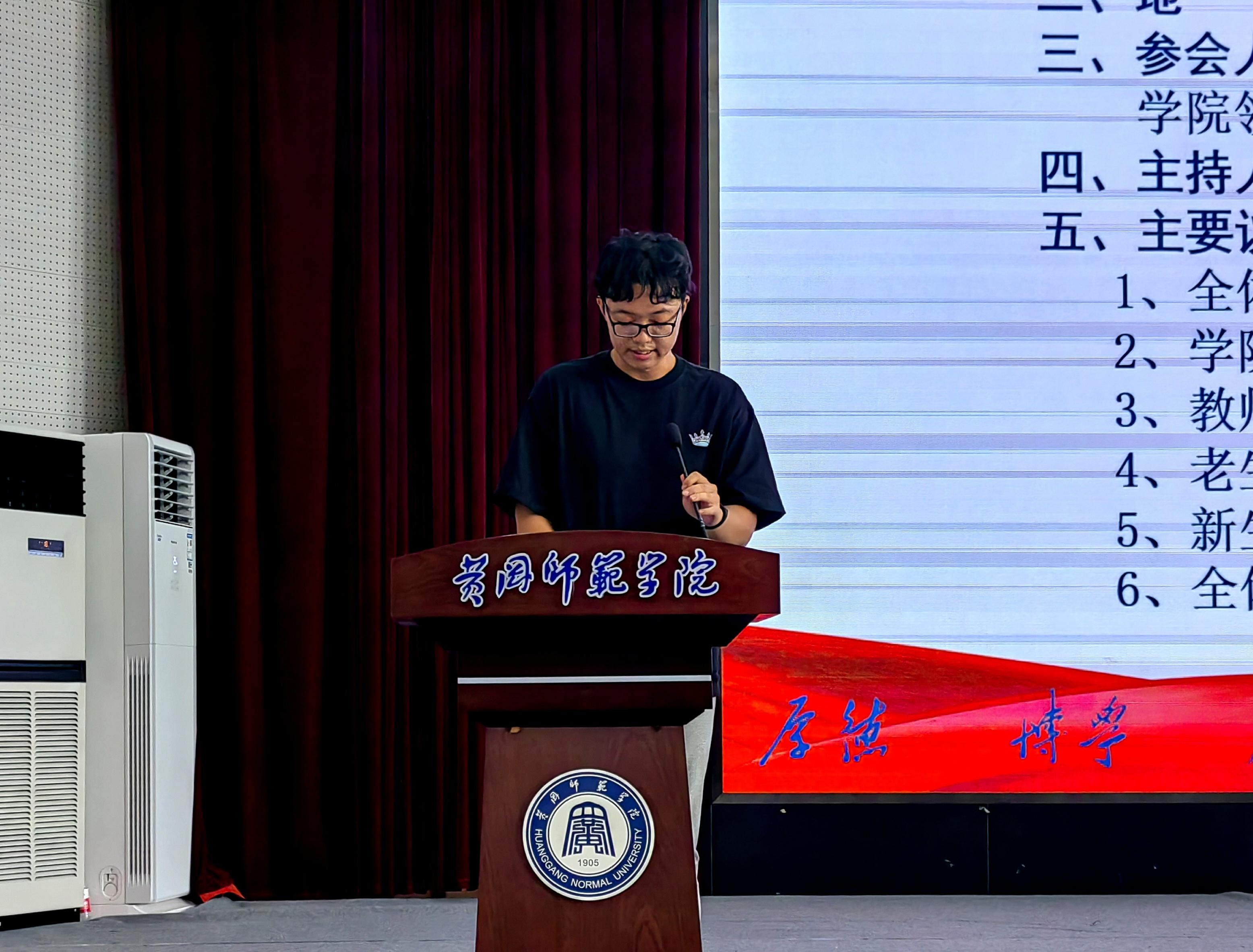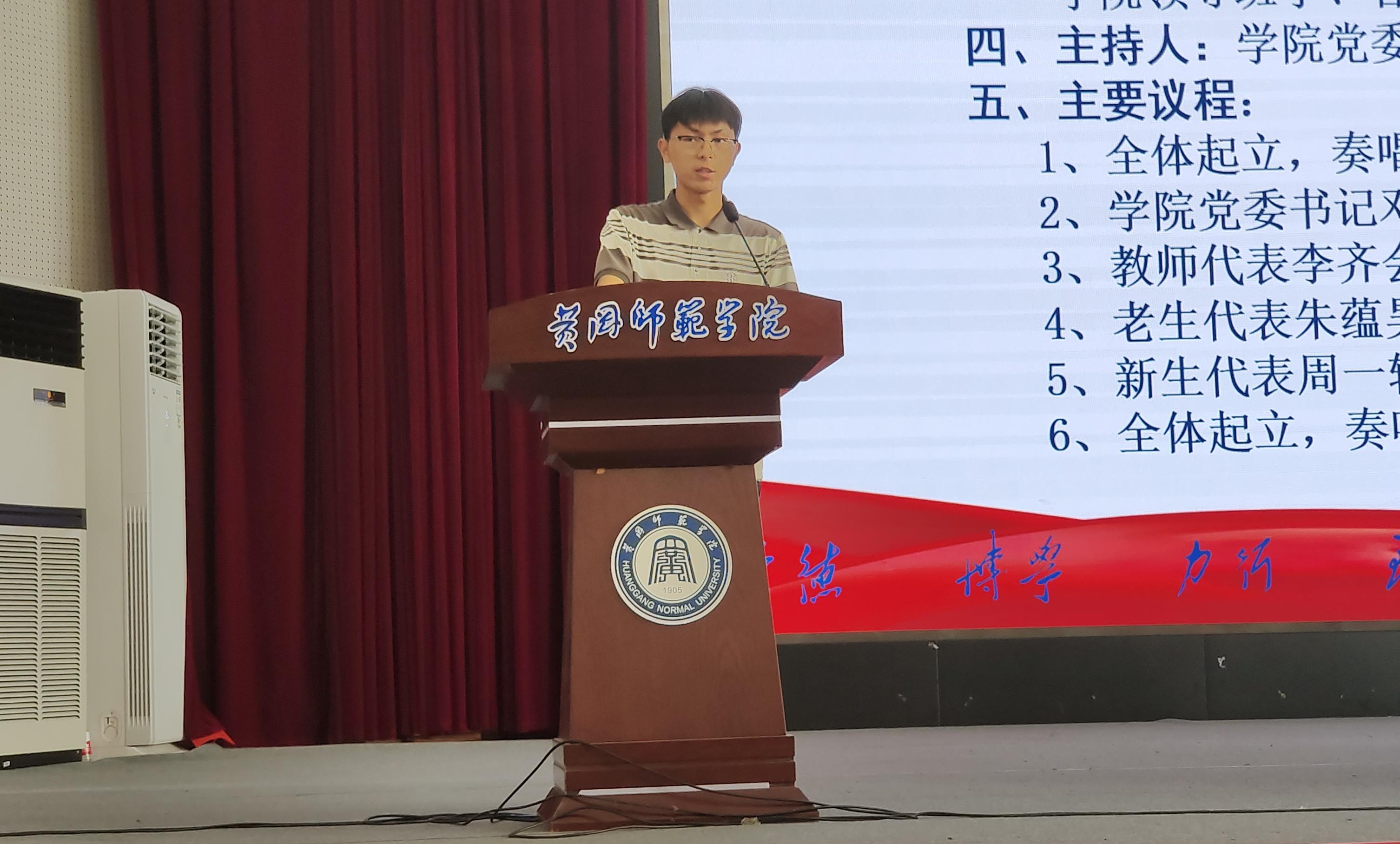 大学第四项,由新生代表周一轩同学发言。周同学首先表达了对大学新生活的期待,表示将克服困难与挑战,肩负起责任与使命。最后他鼓励大家以梦为马,不负韶华,担当起属于新时代青年的责任与使命,在不懈奋斗中绽放绚丽之花!