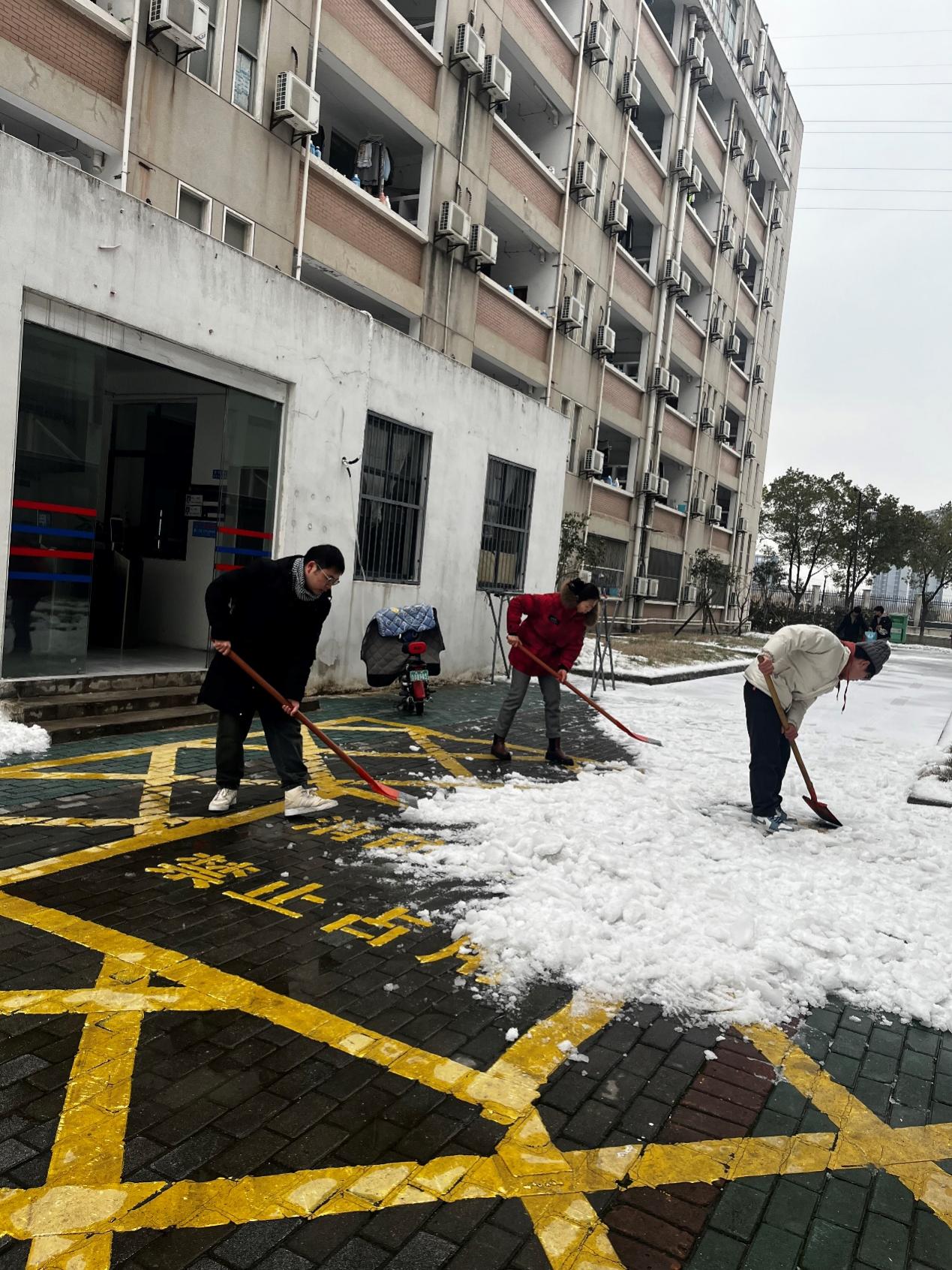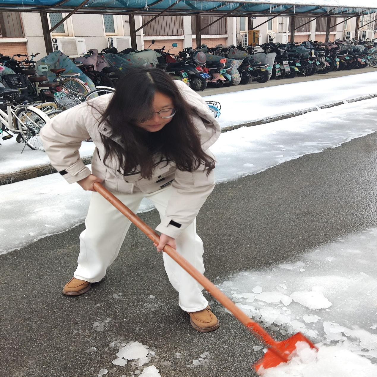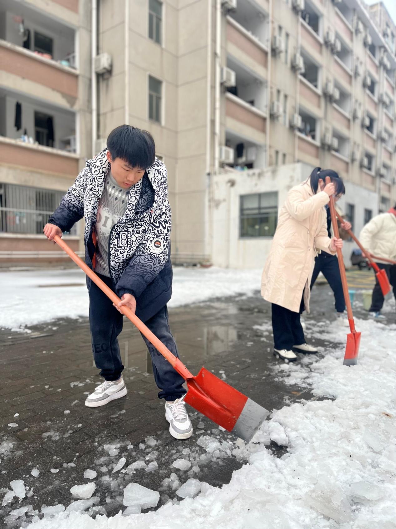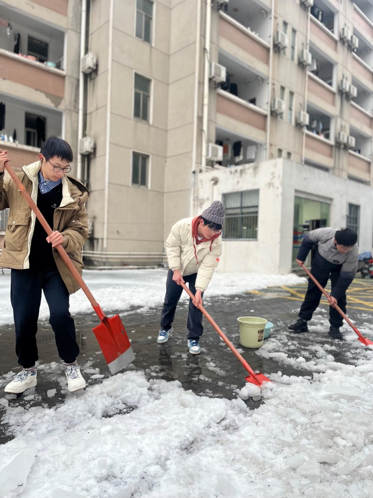 由于极端天气,已经抵达校园的员工并不多。尽管如此,在公司发布铲雪除冰志愿令后,仍有大批同学积极响应号召,在老师的安排下有条不紊的清理宿舍楼前道路。紫园一栋、二栋门前,师生志愿者们不畏严寒,挥舞着铁锹,清除路面积雪。大家齐心协力,默契配合,一个个干劲十足。