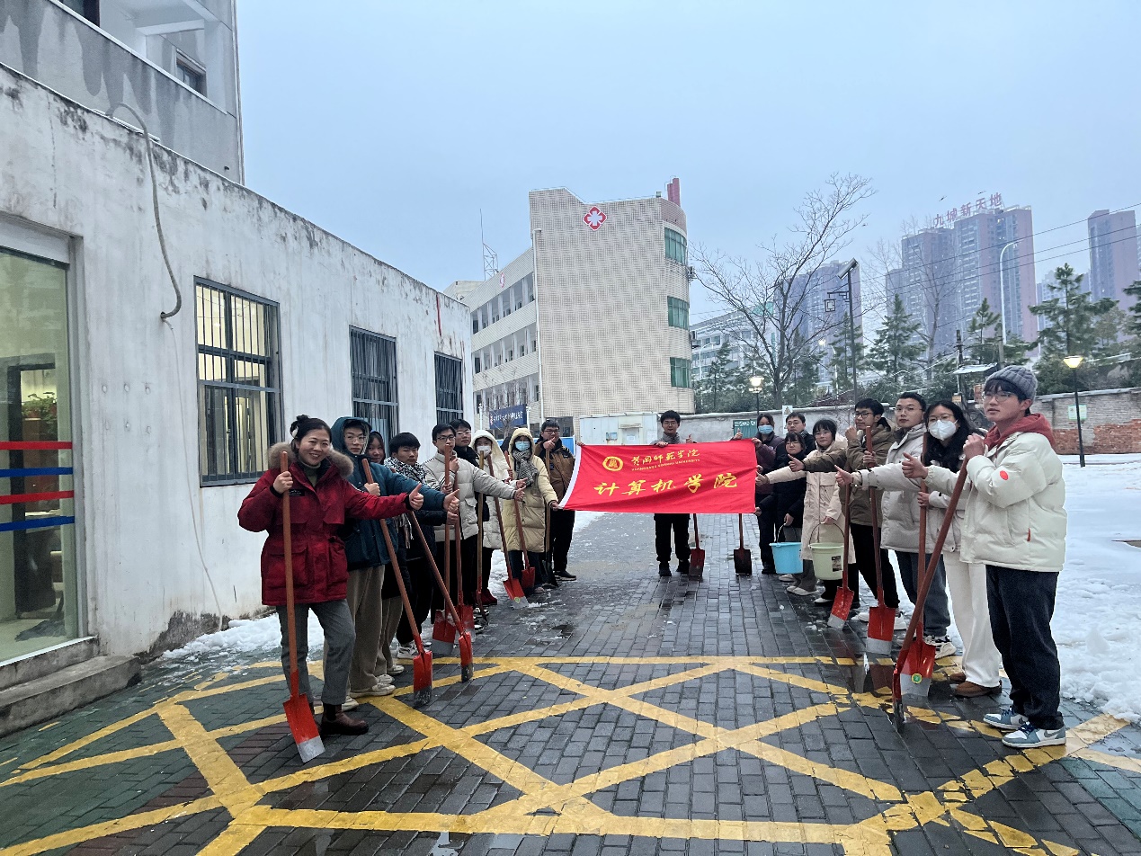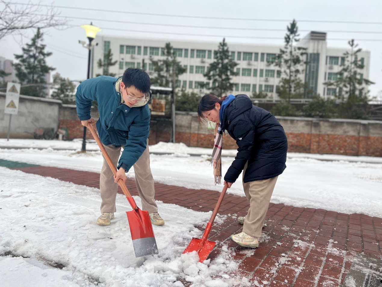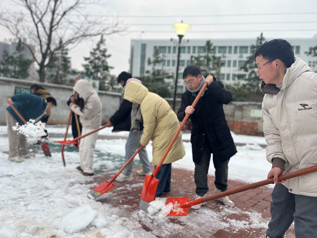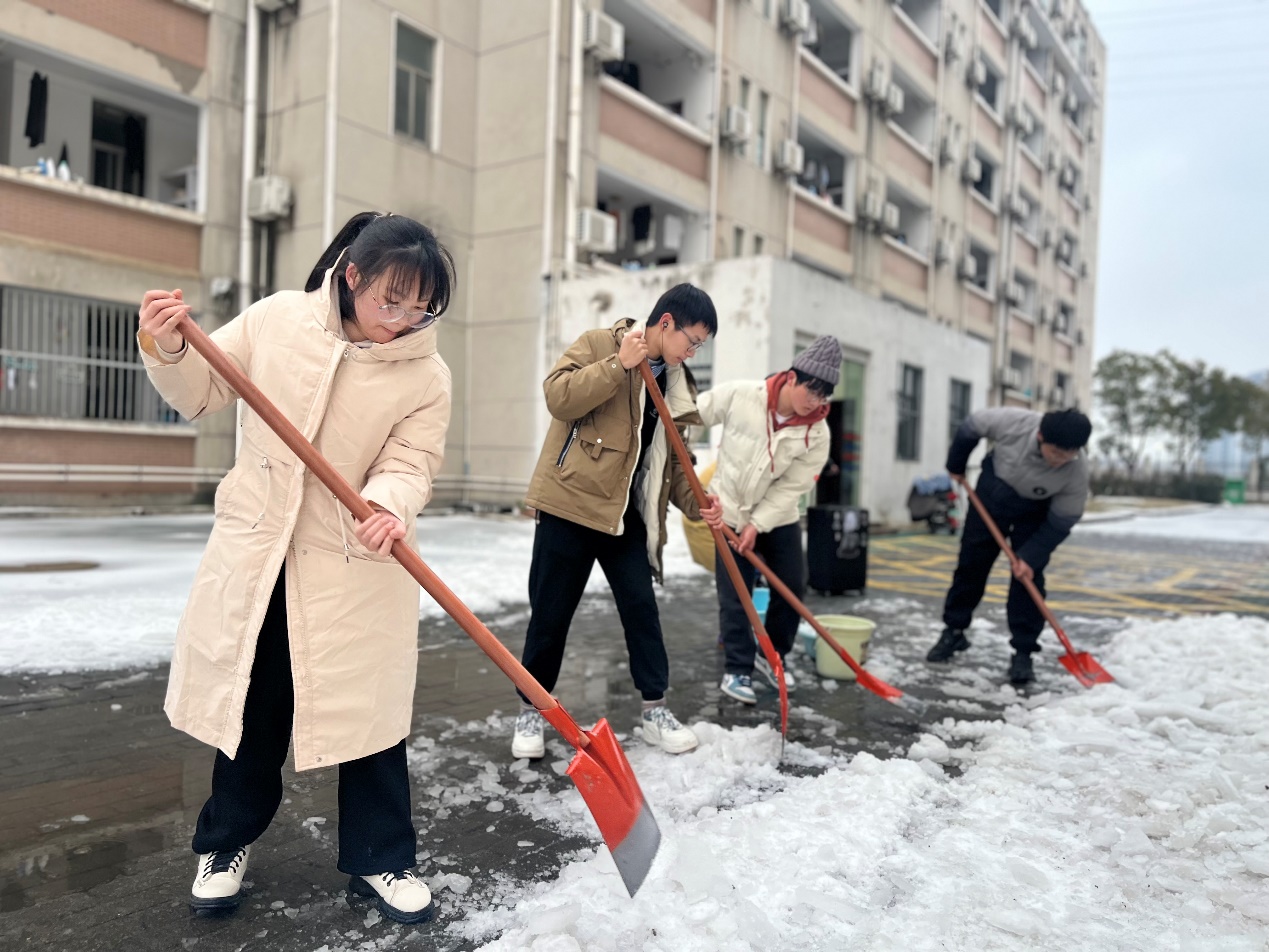 由于极端天气,已经抵达校园的员工并不多。尽管如此,在公司发布铲雪除冰志愿令后,仍有大批同学积极响应号召,在老师的安排下有条不紊的清理宿舍楼前道路。紫园一栋、二栋门前,师生志愿者们不畏严寒,挥舞着铁锹,清除路面积雪。大家齐心协力,默契配合,一个个干劲十足。