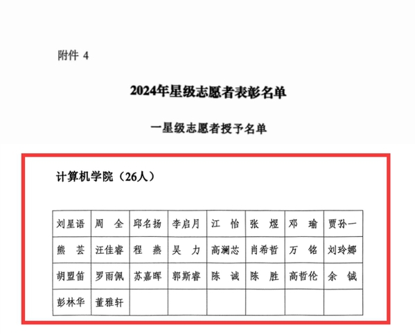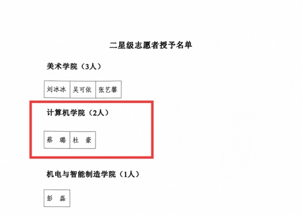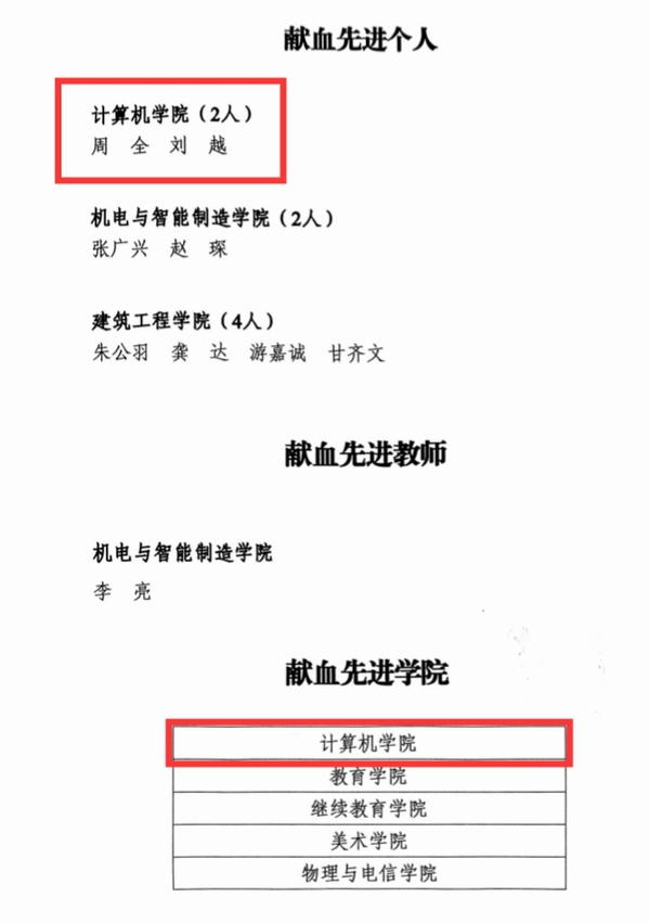 williamhill官网网站荣获2024年度“三下乡”优秀团队一等奖,2024年度无偿献血优秀组织单位。计科2201班蔡璐等6名员工被授予2024年度“三下乡”优秀个人称号。软工2102班杜豪、计科2201班蔡璐被授予2024年度二星级志愿者称号,软工2202班刘星语等26名员工被授予2024年度一星级志愿者称号,软工2101班刘越、软工2303班周全被授予献全血先进个人称号。