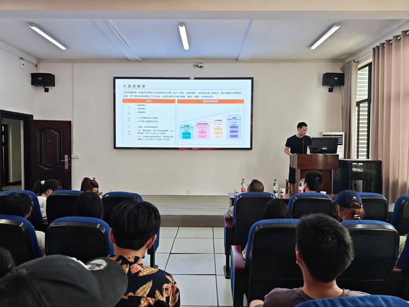 紧接着,软件开发核心工程师潘曾豪、方泽轩从人工智能大模型发展现状、DeepSeek热潮、大模型在企业应用落地方式、案例与技术落地以及未来趋势与挑战等五个方面同大家交流了大模型技术,为我们提供了多维度的学习和成长启示。