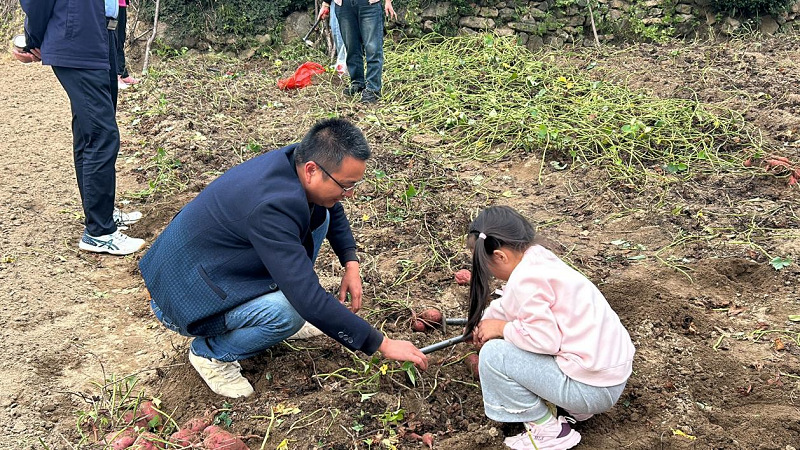 在开阔的田间地头,田垄里的红薯冒出嫩绿的藤蔓,红彤彤的柿子挂满枝头,丰收的景象格外喜人。在讲解员的指导下,老师们和孩子们拿着小铲子,顺着藤蔓轻轻拨开泥土,挖出一个个饱满的红薯。随后,老师们小心翼翼地用竹竿轻敲柿子树枝,成熟的柿子便“噗通”一声落入孩子们提前铺好的布兜里,孩子们欢呼着捡拾,分享收获的果实。